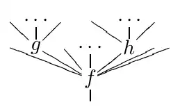Regardons la structure algébrique que l'on peut mettre sur les ensembles des fonctions à plusieurs variables de (pour tout entier n positif) dans , où est un espace vectoriel réel. On peut multiplier une fonction par un réel, et additionner deux fonctions de . On a ainsi une structure d'espace vectoriel sur chaque , donc une structure de module sur . On peut rajouter une opération de composition, généralisant le classique existant pour les fonctions d'une variable : à et , on peut associer une fonction à n+m-1 variables où on a remplacé par la fonction . On note cette opération , et on l'appelle « produit de composition partiel » (de g à la ième place de f). On peut représenter graphiquement cette opération par une greffe d'arbres :