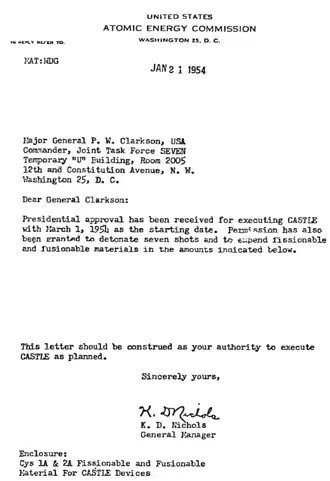 Les spécialistes ont calculé que les cratères formés par les explosions seraient d'une taille comparable à l'essai Ivy Mike, d'une puissance de 10,4 mégatonnes, qui a formé à l'atoll d'Eniwetok un cratère d'environ 1,6 km de diamètre et rayé de la carte l'île d'Elugelab[2]. Les prototypes de l'opération Castle mettent en jeu des puissances comparables, ce qui a occasionné des débats à l'intérieur de l'AEC. En effet, l'ampleur des destructions subies par les infrastructures d'Eniwetok auraient pu servir d'argument en faveur de l'arrêt des essais thermonucléaires. Le JTF-7 reçoit le feu vert du responsable de l'AEC, le Major General Kenneth D. Nichols, le .