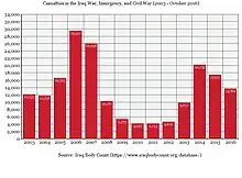 La seconde guerre civile irakienne[31], ou seconde guerre confessionnelle irakienne[32],[33], est une phase de la guerre d'Irak qui a commencé le et s'est officiellement achevée le . Elle fait suite à la première guerre confessionnelle irakienne, qui s'est déroulée de 2006 à 2009.
