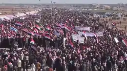 Les protestataires rassemblés dans le camp viennent cependant de différents mouvements politiques, les témoins observent la présence de drapeaux irakiens de l'époque de Saddam Hussein, d'autres d'après l'invasion[pas clair], le drapeau syrien de l'Armée syrienne libre, mais aussi le drapeau noir des salafistes sont également relevés[50].