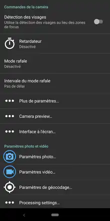 - Marquage de localisation GPS en option (géolocalisation) des photos et vidéos; pour les photos, cela inclut la direction de la boussole (GPSImgDirection, GPSImgDirectionRef).