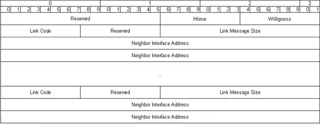 - « Link Code » : Code identifiant le type de lien (pas d'information, symétrique, asymétrique, etc.) entre l'expéditeur et les interfaces listées (« Neighbor Interface Address »)