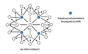 L'idée des relais multipoints est de minimiser l'inondation de paquets de diffusion dans le réseau en réduisant les retransmissions en double vers un même nœud. Chaque nœud dans le réseau sélectionne un ensemble de nœuds dans son voisinage, qui retransmet ses paquets. Cet ensemble de nœuds voisins sélectionné est appelé le relais multipoint de ce nœud ou MPR[2].