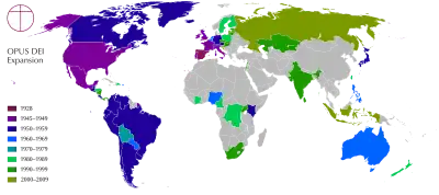En 2007, l'Opus Dei arrive en Russie[22]. En 2009, en Indonésie, en Roumanie et en Corée du Sud[11]. Depuis la mort de son fondateur en 1975, l'Opus Dei a ainsi connu une vague d'expansion toujours en cours et est présente dans de nombreux pays. Les pays où elle compte le plus de membres sont cependant l'Espagne, l'Italie et les pays d'Amérique latine, qui représentent ses bastions historiques[23].