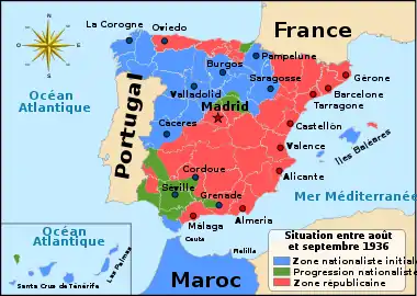 À partir du , au lendemain du Coup d'État des 17 et 18 juillet 1936, conscients de l'insuffisance de leurs moyens respectifs pour soutenir un effort de guerre, le gouvernement de José Giral et le général Franco (alors à la tête de l'armée d'Afrique) sollicitent une assistance matérielle auprès des capitales européennes : Paris pour le gouvernement en place, Rome et Berlin pour le camp nationaliste. Ces initiatives amorcent l'internationalisation progressive du conflit[3].