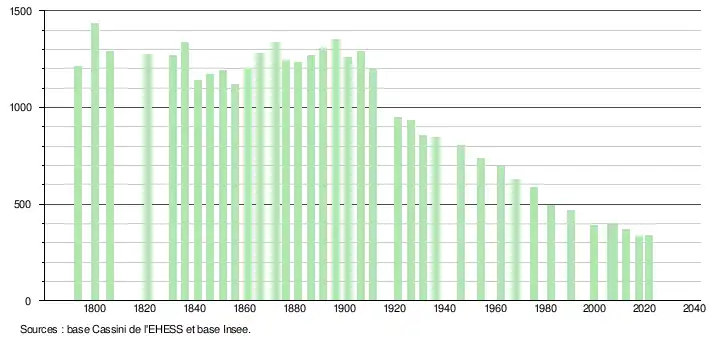 L'évolution du nombre d'habitants est connue à travers les recensements de la population effectués dans la commune depuis 1793. Pour les communes de moins de 10 000 habitants, une enquête de recensement portant sur toute la population est réalisée tous les cinq ans, les populations légales des années intermédiaires étant quant à elles estimées par interpolation ou extrapolation[24]. Pour la commune, le premier recensement exhaustif entrant dans le cadre du nouveau dispositif a été réalisé en 2007[25].