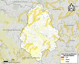 Le retrait-gonflement des sols argileux est susceptible d'engendrer des dommages importants aux bâtiments en cas d’alternance de périodes de sécheresse et de pluie[17]. 18,3 % de la superficie communale est en aléa moyen ou fort (27 % au niveau départemental et 48,5 % au niveau national métropolitain)[Carte 2]. Depuis le , en application de la loi ÉLAN, différentes contraintes s'imposent aux vendeurs, maîtres d'ouvrages ou constructeurs de biens situés dans une zone classée en aléa moyen ou fort[Note 2],[18].
