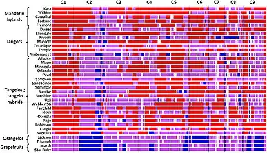 La phylogénomique a permis de rassembler (2014) toutes les accessions de C . sinensis, C. aurantium, C. paradisi, les hybrides de mandarine, les tangors, les tangelos et mandelo, les orangelos dans une vaste population mélange dans des proportions variables de deux taxons ancestraux: mandarines (C. reticulata) et pamplemousses (C. maxima).