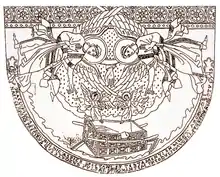 Il représente l'arche d'alliance entourée des deux anges d'or qui, selon la Bible, entourent le propitiatoire et il ajoute encore deux autres anges, images « réelles » cette fois, comme s'il s'agissait d'entourer la Vierge Marie et son divin fils.
