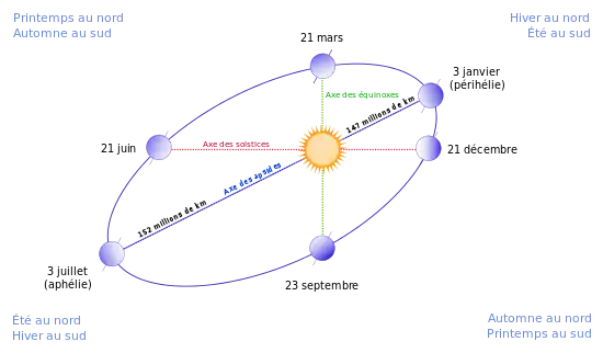 Le schéma suivant montre la relation entre la ligne des solstices, la ligne des équinoxes et la ligne des apsides de l'orbite de la Terre. Le périhélie se situe entre le 2 et le , alors que l'aphélie se situe entre le 3 et le . Les solstices se situent entre le 20- et le 21-, alors que les équinoxes se situent entre le 19- et le 22-.