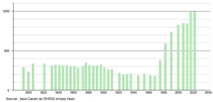 L'évolution du nombre d'habitants est connue à travers les recensements de la population effectués dans la commune depuis 1793. Pour les communes de moins de 10 000 habitants, une enquête de recensement portant sur toute la population est réalisée tous les cinq ans, les populations légales des années intermédiaires étant quant à elles estimées par interpolation ou extrapolation[17]. Pour la commune, le premier recensement exhaustif entrant dans le cadre du nouveau dispositif a été réalisé en 2006[18].