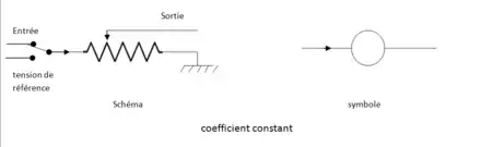 Cet élément effectue le produit d'une variable (la tension d'entrée) par une constante dont la valeur ne peut être comprise qu'entre zéro et un. Pour effectuer correctement le réglage, un commutateur remplace la tension d'entrée par la tension de référence et un voltmètre de précision est connecté sur le curseur. Technologiquement, il a d'abord été réalisé par un potentiomètre de précision multi-tour qui devait être réglé manuellement, puis sur les calculateurs haut de gamme chaque potentiomètre a été associé à un servomécanisme réglable à partir d'un clavier et dans les années 1970, il a été remplacé par un réseau de résistances commutés électroniquement (multiplieur hybride). Dans les calculateurs hybrides, le réglage des coefficients étaient télécommandés à partir du calculateur numérique.