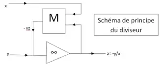 Le diviseur comporte les mêmes éléments que le multiplieur (potentiomètre asservi mécaniquement ou réseau de résistances et de diodes), mais ils sont montés en contre réaction de l'amplificateur opérationnel (et non en tant qu'élément d'entrée).
