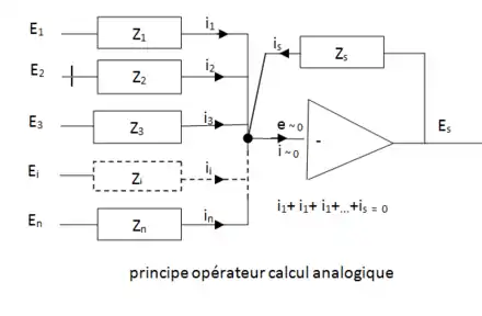 Associé à des éléments passifs linéaires ou non, l'amplificateur opérationnel est le cœur des opérateurs, c'est-à-dire des modules de calculs tels que les sommateurs, les intégrateurs, les multiplieurs.