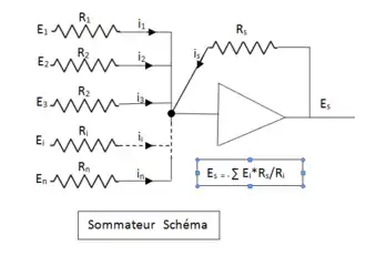 L'objectif de ce module est d'effectuer la somme de plusieurs tensions. Les impédances d'entrée et de contre-réaction sont toutes des résistances. Dans la pratique le rapport Rs/Ri = 1 ou 10, ce qui correspond à un gain de 1 ou 10 selon les entrées utilisées (voir la représentation symbolique du sommateur). Il est à noter que la précision de l'opération dépend directement de la qualité de l'amplificateur opérationnel (courant d'entrée et tension d'offset négligeable) et de la précision de chacune des résistances. (erreur inférieure à sur les calculateurs « haut de gamme »). Pour obtenir une telle précision, les résistances sont du type « bobiné » (bobinage double en sens inverse pour minimiser l'effet d'inductance qui nuirait à la précision dynamique du sommateur). Les valeurs de résistances communément utilisées sont de 100 kΩ et 1 MΩ pour les calculateurs ayant une référence de 100 volts, ou de 10 kΩ et 100 kΩ pour une référence de 10 volts.