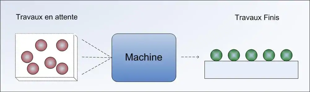 Dans ce cas, on dispose d’un ensemble de machines identiques pour réaliser les travaux. Les travaux se composent d’une seule opération et un travail exige une seule machine. L’ordonnancement s’effectue en deux phases : la première phase consiste à affecter les travaux aux machines et la deuxième phase consiste à établir la séquence de réalisation sur chaque machine.
