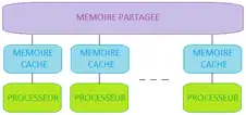 Les architectures multicœurs partagent, via un unique bus, les multiples accès simultanés que leurs cœurs réclament à la mémoire centrale. Afin de contourner autant que possible ce goulot d'étranglement elles incluent différents niveaux de mémoires caches. Chaque cœur se voit doté d'un premier niveau de cache qui lui est spécifiquement dédié. À l'autre extrémité, à proximité du bus d'accès à la mémoire centrale, un cache commun fédère l'ensemble des requêtes d'accès à des données que les caches inférieurs n'ont su servir. Comme les caches spécifiquement associés à un cœur mémorisent les transformations opérées sur les données, un système de maintien de la cohérence des données est mis en place entre ces différents caches. Lorsqu'un cœur accède à une donnée stockée dans le cache associé à un autre cœur, cette donnée est transférée jusqu'au cache associé au cœur qui en a demandé l'accès.