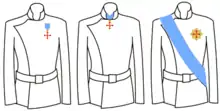 - Les chevaliers d'office portent la croix, sans trophée d'armes ni couronne, suspendue à un ruban bleu ciel sur le côté gauche de la poitrine.