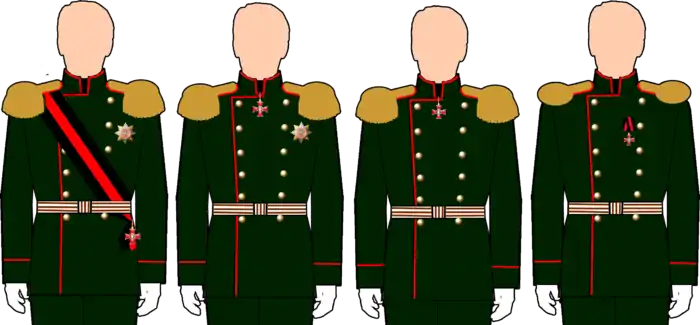Par le décret du , le ruban noué à la verticale fut rétabli. Les militaires titulaires de l'Ordre de Saint-Vladimir (4e classe), de Sainte-Anne (3e classe), de Saint-Stanislas (3e classe) avec glaives en sautoir portèrent leurs insignes avec un ruban noué horizontalement. Seuls, les militaires, auteurs d'un fait de bravoure portèrent ce ruban noué[21].