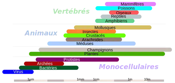 Ordre de grandeur des cellules (de l'ordre de 1 µm à 1 mm, soit 10–6 à 10−3 m) :