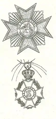 La décoration est une croix à quatre branches émaillées de blanc et à huit pointes. Le ruban est jaune avec un large bande rouge au milieu et un étroit liseré blanc.