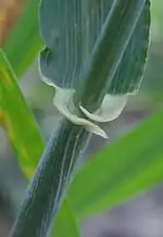 Chez les plantes de la famille des Poaceae (graminées), les oreillettes sont des expansions symétriques du limbe, à la base de celui-ci à la jonction avec le gaine foliaire. Ces expansions, peuvent rester dans le plan du limbe foliaire, ou s'infléchir. Elles peuvent également s'entrecroiser, comme chez les plantes du genre Hordeum. Leur forme variable, leur caractère cilié ou non, leur couleur, leur taille, leur présence ou leur absence, sont autant de caractères taxinomiques importants pour distinguer les différents genres de graminées[1].