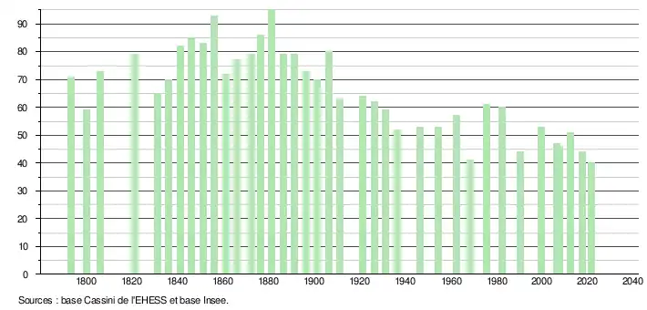 L'évolution du nombre d'habitants est connue à travers les recensements de la population effectués dans la commune depuis 1793. Pour les communes de moins de 10 000 habitants, une enquête de recensement portant sur toute la population est réalisée tous les cinq ans, les populations légales des années intermédiaires étant quant à elles estimées par interpolation ou extrapolation[16]. Pour la commune, le premier recensement exhaustif entrant dans le cadre du nouveau dispositif a été réalisé en 2007[17].