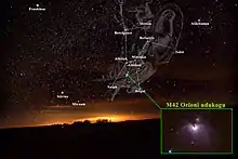 L'objet sans doute le plus incontournable de la constellation est M42, plus connu sous le nom de « grande nébuleuse d'Orion ». Cette vaste région de formation stellaire est située à environ 1 350 années-lumière de la Terre et sa magnitude apparente égale à 3,7 la rend aisément distinguable à l'œil nu, sous la forme d'une faible tâche laiteuse, sous un ciel sombre à l'écart de la pollution lumineuse des villes. Aux jumelles, la nébuleuse révèle un système gazeux et de jeunes étoiles, système dominé par un groupe de quatre étoiles géantes connu sous le nom de trapèze d'Orion.