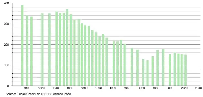 L'évolution du nombre d'habitants est connue à travers les recensements de la population effectués dans la commune depuis 1793. Pour les communes de moins de 10 000 habitants, une enquête de recensement portant sur toute la population est réalisée tous les cinq ans, les populations légales des années intermédiaires étant quant à elles estimées par interpolation ou extrapolation[27]. Pour la commune, le premier recensement exhaustif entrant dans le cadre du nouveau dispositif a été réalisé en 2006[28].