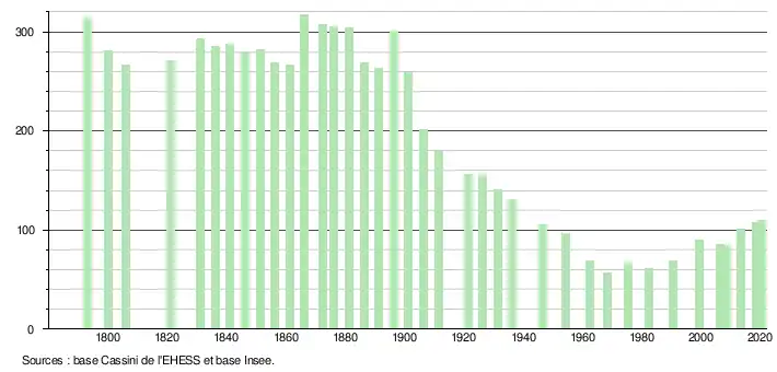 L'évolution du nombre d'habitants est connue à travers les recensements de la population effectués dans la commune depuis 1793. Pour les communes de moins de 10 000 habitants, une enquête de recensement portant sur toute la population est réalisée tous les cinq ans, les populations légales des années intermédiaires étant quant à elles estimées par interpolation ou extrapolation[49]. Pour la commune, le premier recensement exhaustif entrant dans le cadre du nouveau dispositif a été réalisé en 2008[50].