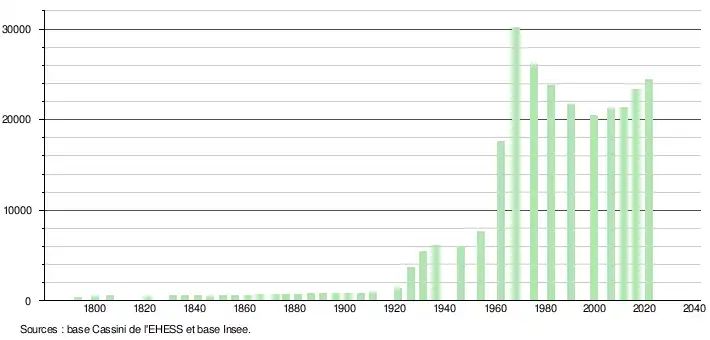 - Par convention dans Wikipédia, le principe a été retenu de n’afficher dans le tableau des recensements et le graphique, pour les populations légales postérieures à 1999, que les populations correspondant à une enquête exhaustive de recensement pour les communes de moins de 10 000 habitants, et que les populations des années 2006, 2011, 2016, etc. pour les communes de plus de 10 000 habitants, ainsi que la dernière population légale publiée par l’Insee pour l'ensemble des communes.