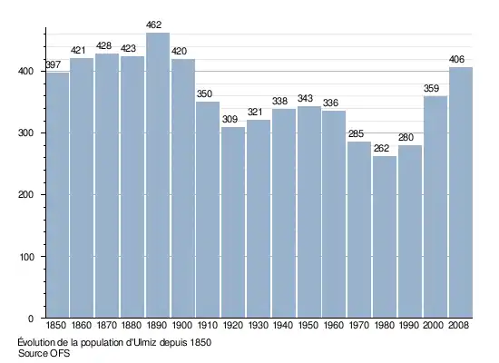 Le graphique suivant résume l'évolution de la population d'Ulmiz entre 1850 et 2008[3] :