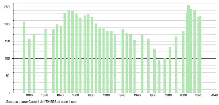L'évolution du nombre d'habitants est connue à travers les recensements de la population effectués dans la commune depuis 1793. Pour les communes de moins de 10 000 habitants, une enquête de recensement portant sur toute la population est réalisée tous les cinq ans, les populations légales des années intermédiaires étant quant à elles estimées par interpolation ou extrapolation[24]. Pour la commune, le premier recensement exhaustif entrant dans le cadre du nouveau dispositif a été réalisé en 2004[25].