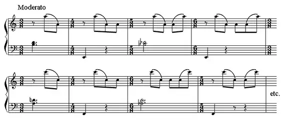 « J'ai fondé mon travail sur le fait que le changement de mesure intensifie souvent le déroulement formel, et cette constatation m'a donné l'idée de concevoir la structure métrique d'une composition de façon que chaque mesure corresponde à un modèle métrique différent. Et si l'on élabore les rapports métriques d'après une perspective mathématique — c'est-à-dire selon le principe des séries ou de la combinatoire — le déroulement métrique cesse d'être arbitraire ou le fruit du hasard. Il se produit alors de nouvelles symétries, d'un niveau supérieur, d'intéressants recoupements entre série métrique et phrase musicale, des reprises variées, bien d'autres phénomènes encore[2]. »