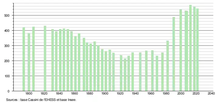 L'évolution du nombre d'habitants est connue à travers les recensements de la population effectués dans la commune depuis 1793. Pour les communes de moins de 10 000 habitants, une enquête de recensement portant sur toute la population est réalisée tous les cinq ans, les populations légales des années intermédiaires étant quant à elles estimées par interpolation ou extrapolation[26]. Pour la commune, le premier recensement exhaustif entrant dans le cadre du nouveau dispositif a été réalisé en 2007[27].