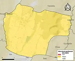 Le retrait-gonflement des sols argileux est susceptible d'engendrer des dommages importants aux bâtiments en cas d’alternance de périodes de sécheresse et de pluie. 99,7 % de la superficie communale est en aléa moyen ou fort (44,5 % au niveau départemental et 48,5 % au niveau national). Sur les 53 bâtiments dénombrés sur la commune en 2019, 53 sont en aléa moyen ou fort, soit 100 %, à comparer aux 75 % au niveau départemental et 54 % au niveau national. Une cartographie de l'exposition du territoire national au retrait gonflement des sols argileux est disponible sur le site du BRGM[23],[Carte 3].