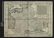 Oronce Fine est également l’auteur de la première carte de France (nommée Gallia[6],[13]) dressée et publiée en France même, qui connait cinq éditions entre 1525 et 1557. C'est un carte de grande taille : 0,95m sur 0,68m. Elle correspond à un échelle approximative de 1/1 750 000[14]. Par certains traits, celle-ci se rattache aux cartes issues de la Géographie de Ptolémée (projection trapézoïdale, divisions en climats), mais le cartographe français en améliore nettement les contours. En géographe mathématicien, Oronce Fine est préoccupé par le calcul des longitudes et latitudes et il met au point à cet effet un « méthoroscope géographique », astrolabe modifié par l’adjonction d’une boussole. Dans sa Cosmographia (1530), il donne les coordonnées de cent vingt-quatre villes françaises, tantôt empruntées à Ptolémée, tantôt corrigées et complétées par ses propres observations. Par ailleurs, Fine fait cohabiter toponymes anciens et modernes « afin de satisfaire à ceulx qui se délectent à lire les anciennes histoires de la dicte Gaule ». Cette France-Gaule englobe d’ailleurs toute la rive gauche du Rhin ainsi que le Nord de l’Italie ; les Alpes, réduites à quelques taupinières, ne constituent en rien un obstacle aux ambitions italiennes des rois de France...