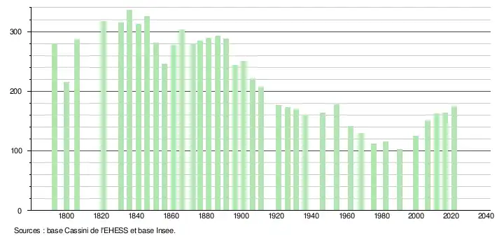 L'évolution du nombre d'habitants est connue à travers les recensements de la population effectués dans la commune depuis 1793. Pour les communes de moins de 10 000 habitants, une enquête de recensement portant sur toute la population est réalisée tous les cinq ans, les populations légales des années intermédiaires étant quant à elles estimées par interpolation ou extrapolation[25]. Pour la commune, le premier recensement exhaustif entrant dans le cadre du nouveau dispositif a été réalisé en 2006[26].