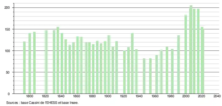 L'évolution du nombre d'habitants est connue à travers les recensements de la population effectués dans la commune depuis 1793. Pour les communes de moins de 10 000 habitants, une enquête de recensement portant sur toute la population est réalisée tous les cinq ans, les populations légales des années intermédiaires étant quant à elles estimées par interpolation ou extrapolation[44]. Pour la commune, le premier recensement exhaustif entrant dans le cadre du nouveau dispositif a été réalisé en 2005[45].
