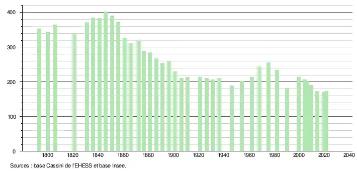 L'évolution du nombre d'habitants est connue à travers les recensements de la population effectués dans la commune depuis 1793. Pour les communes de moins de 10 000 habitants, une enquête de recensement portant sur toute la population est réalisée tous les cinq ans, les populations légales des années intermédiaires étant quant à elles estimées par interpolation ou extrapolation[13]. Pour la commune, le premier recensement exhaustif entrant dans le cadre du nouveau dispositif a été réalisé en 2004[14].