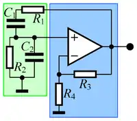 - un circuit de réaction, placé entre la sortie de l'amplificateur et son entrée ; ce circuit met en œuvre diverses impédances : résistances, condensateurs, bobines, quartz.