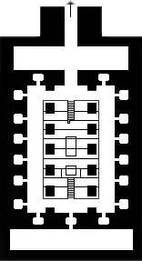 L'entrée se fait par l'ouest par un couloir qui s'étire sur 100 mètres en s'enfonçant dans le sol. Les parois de briques sont recouvertes par des textes funéraires. Après avoir passé deux petites salles, un second couloir (à angle droit avec le premier) mène vers une grande salle transversale, mesurant vingt mètres sur six, ornée par des images et des textes du Livre des morts. On parvient ensuite dans la grande salle du cénotaphe.