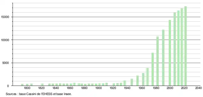 - Par convention dans Wikipédia, le principe a été retenu de n’afficher dans le tableau des recensements et le graphique, pour les populations légales postérieures à 1999, que les populations correspondant à une enquête exhaustive de recensement pour les communes de moins de 10 000 habitants, et que les populations des années 2006, 2011, 2016, etc. pour les communes de plus de 10 000 habitants, ainsi que la dernière population légale publiée par l’Insee pour l'ensemble des communes.