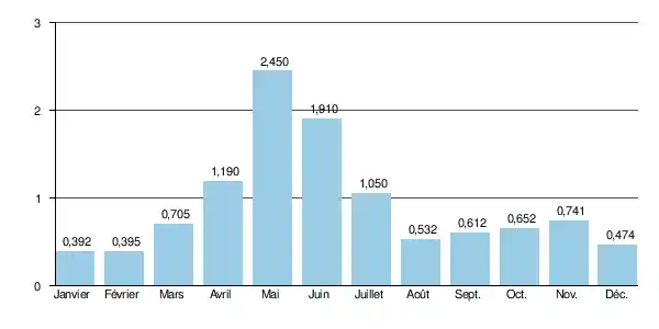 Les crues ne sont guère très importantes, compte tenu de la petitesse du bassin versant. La série des QIX n'a pas été calculée, mais la série des QJX l'a bien été. Les QJX 2 et QJX 5 valent respectivement 3,9 et 5,1 m3/s. Le QJX 10 est de 5,9 m3/s, le QJX 20 de 6,6 m3/s, tandis que le QJX 50 n'a pas été calculé faute d'une durée d'observation suffisante pour le définir.