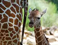 Les « cornes » des girafes sont mises en place dès le stade embryonnaire, ce qui diffère des autres porteurs d'« armes frontales ». À la naissance, elles se présentent sous la forme d'appendices cartilagineux plats, initialement libres de se déplacer, et sont encastrées dans la peau épaisse. Les ossicônes fœtaux et ceux des girafons nouveau-nés ont une section ovale allongée, leur axe étant postéro-médial-antéro-latéral, et le cuir chevelu qui les recouvre est recouvert de longs poils noirs à la naissance[5]. Elles se redressent déjà quelques jours après la naissance et s'ossifient pendant la croissance. Jusqu'à l'âge de quatre ans pour les mâles et de sept ans pour les femelles, elles s'ossifient et se soudent solidement au crâne.