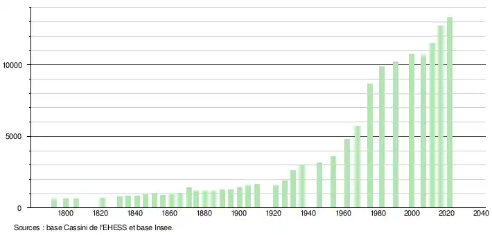 - Par convention dans Wikipédia, le principe a été retenu de n’afficher dans le tableau des recensements et le graphique, pour les populations légales postérieures à 1999, que les populations correspondant à une enquête exhaustive de recensement pour les communes de moins de 10 000 habitants, et que les populations des années 2006, 2011, 2016, etc. pour les communes de plus de 10 000 habitants, ainsi que la dernière population légale publiée par l’Insee pour l'ensemble des communes.