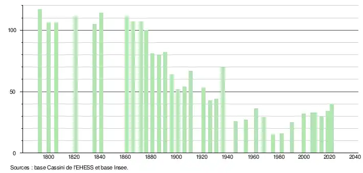 L'évolution du nombre d'habitants est connue à travers les recensements de la population effectués dans la commune depuis 1793. Pour les communes de moins de 10 000 habitants, une enquête de recensement portant sur toute la population est réalisée tous les cinq ans, les populations légales des années intermédiaires étant quant à elles estimées par interpolation ou extrapolation[18]. Pour la commune, le premier recensement exhaustif entrant dans le cadre du nouveau dispositif a été réalisé en 2008[19].