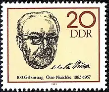 Otto Nuschke, né le à Frohburg (Saxe), et mort le à Hennigsdorf (Brandebourg)[1], est un homme politique allemand puis est-allemand, vice-Premier ministre de la République démocratique allemande de la fondation de celle-ci en 1949 jusqu'à sa mort[2].