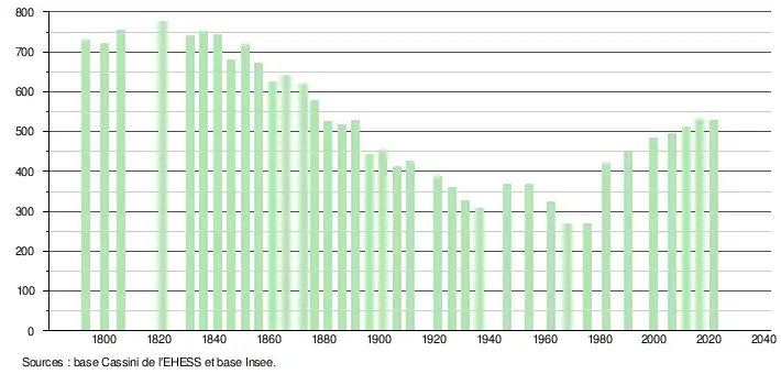L'évolution du nombre d'habitants est connue à travers les recensements de la population effectués dans la commune depuis 1793. Pour les communes de moins de 10 000 habitants, une enquête de recensement portant sur toute la population est réalisée tous les cinq ans, les populations légales des années intermédiaires étant quant à elles estimées par interpolation ou extrapolation[26]. Pour la commune, le premier recensement exhaustif entrant dans le cadre du nouveau dispositif a été réalisé en 2006[27].
