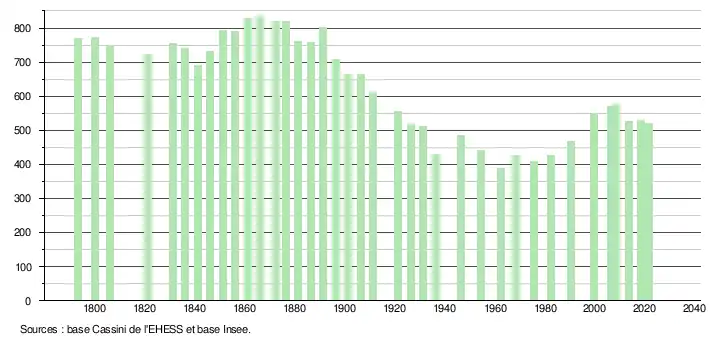 L'évolution du nombre d'habitants est connue à travers les recensements de la population effectués dans la commune depuis 1793. Pour les communes de moins de 10 000 habitants, une enquête de recensement portant sur toute la population est réalisée tous les cinq ans, les populations légales des années intermédiaires étant quant à elles estimées par interpolation ou extrapolation[27]. Pour la commune, le premier recensement exhaustif entrant dans le cadre du nouveau dispositif a été réalisé en 2008[28].